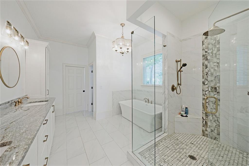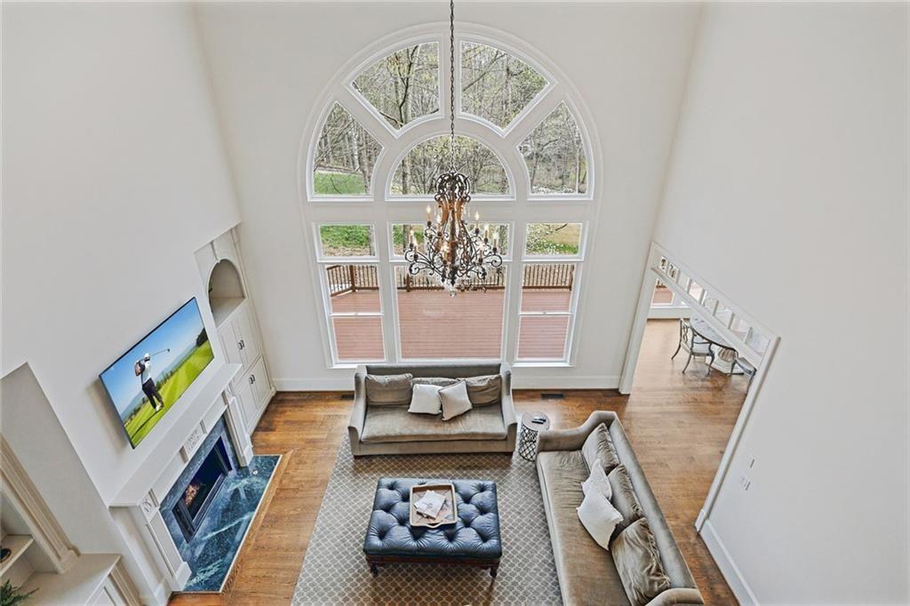 Inside, the home showcases an open and inviting floor plan designed for both everyday living and elegant entertaining. A dramatic two-story foyer and great room are complemented by expansive windows that provide exceptional natural light and frame the scenic surroundings. The main-level primary suite serves as a luxurious retreat, fully renovated with refined finishes, direct access to the deck, and serene golf course views.