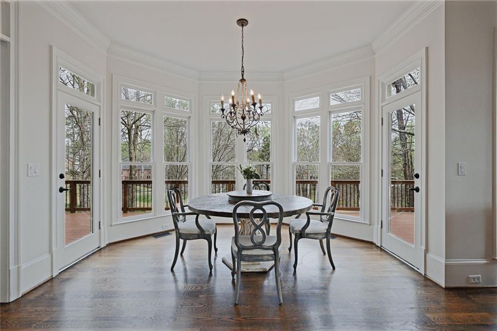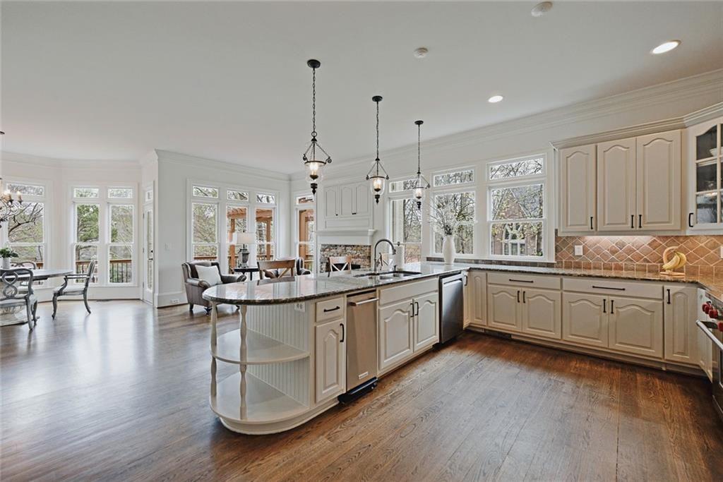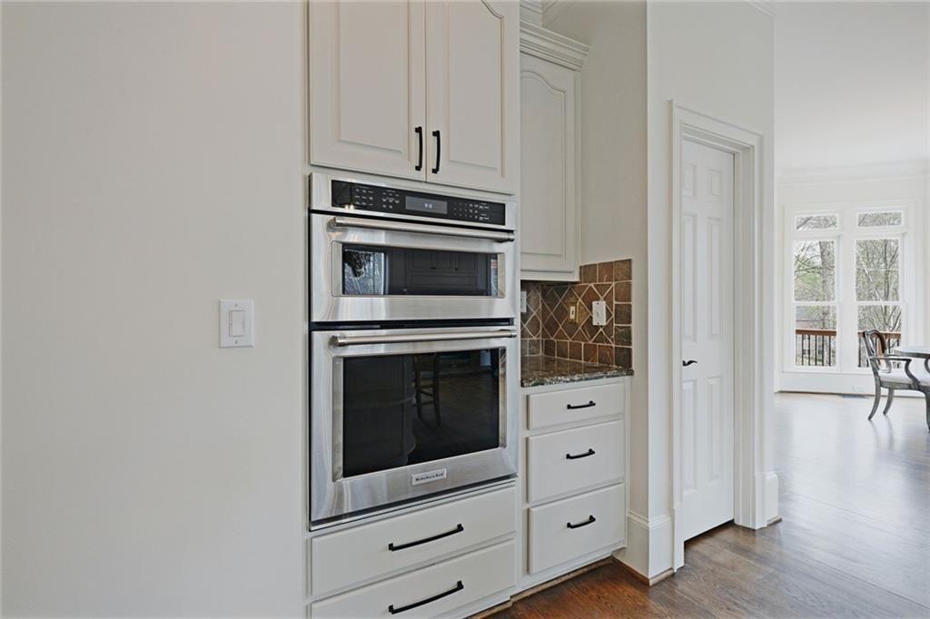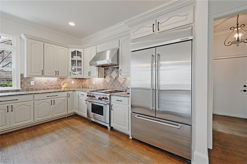 The kitchen has been thoughtfully updated with new hardware, soft-close drawers and painted cabinetry, and a suite of premium appliances including a Wolf range with vent hood, double ovens, refrigerator, microwave, and dishwasher. New modern light fixtures and fresh interior paint throughout the home create a clean, sophisticated aesthetic.