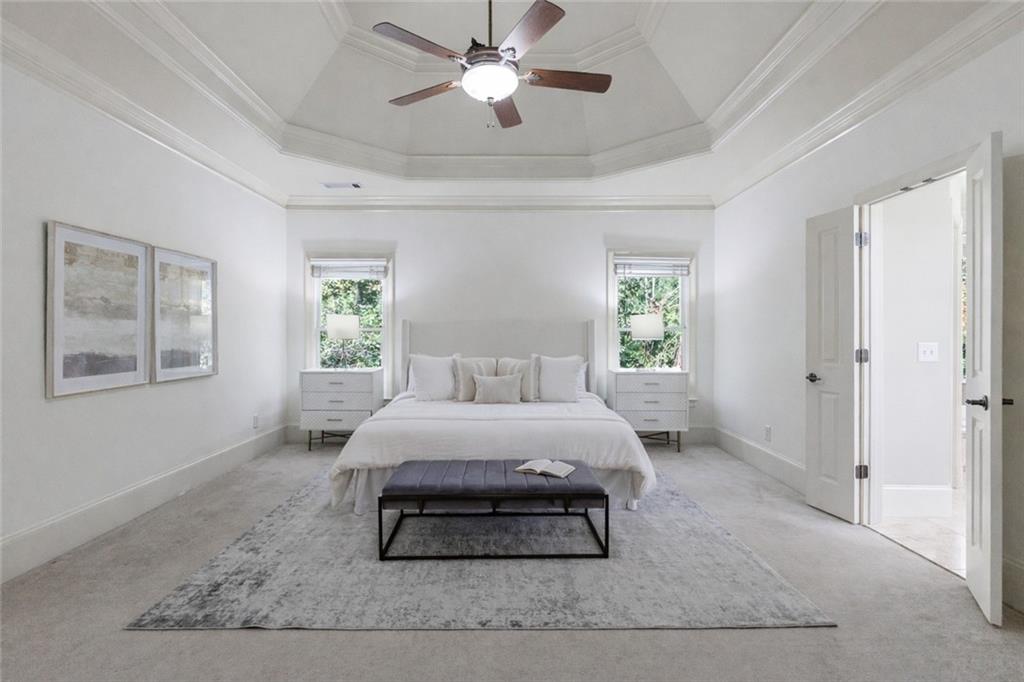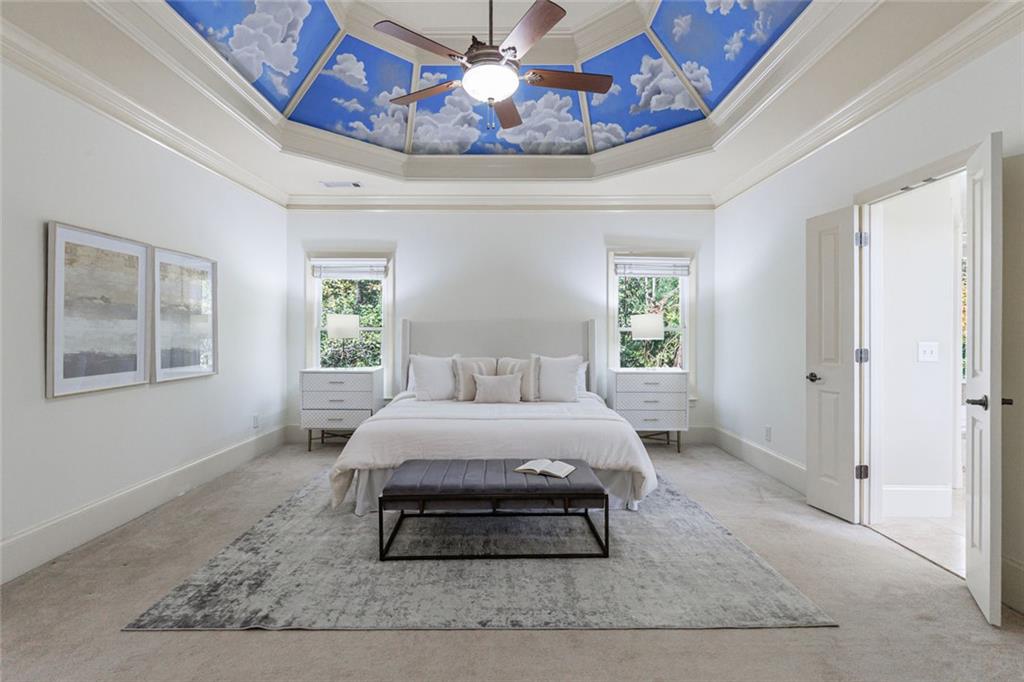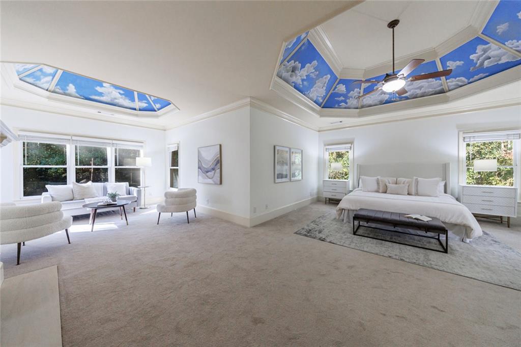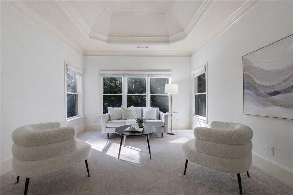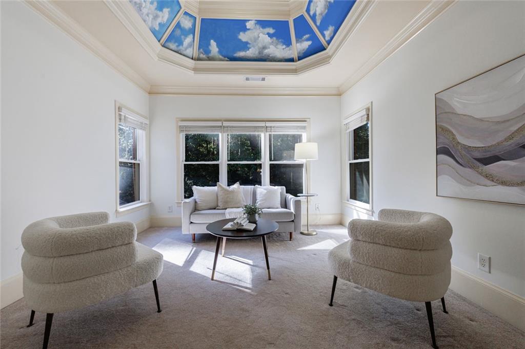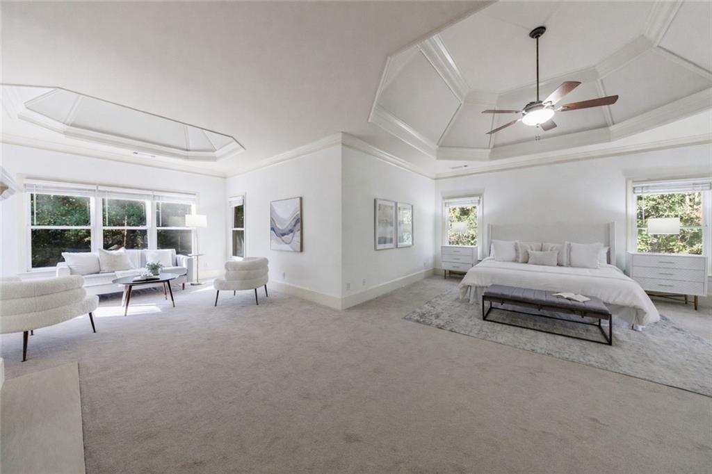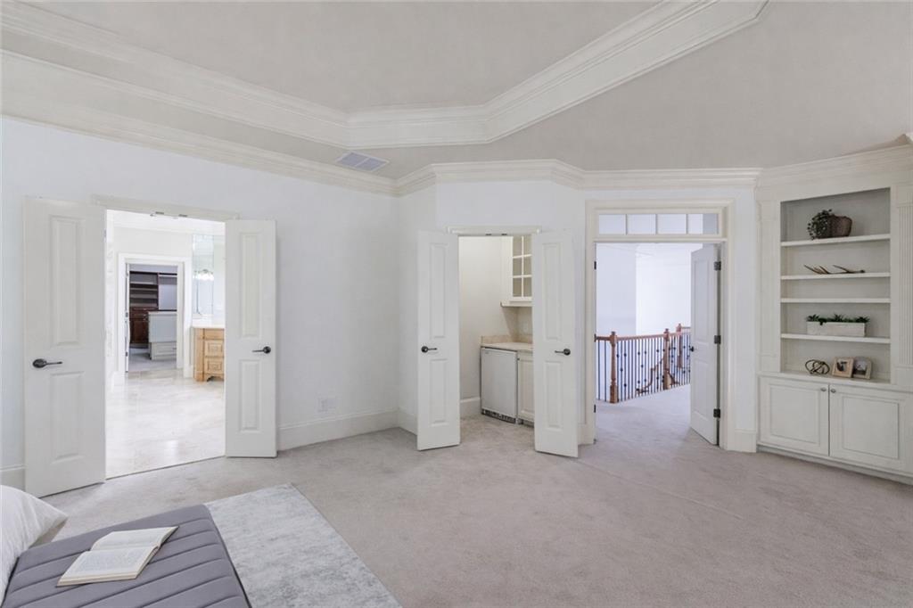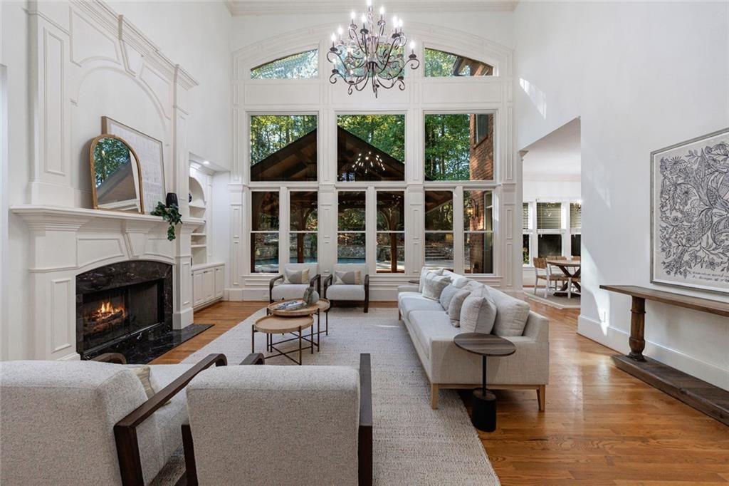 The gourmet kitchen is a culinary masterpiece featuring high ceilings, premium appliances, and an adjoining keeping room with a cozy fireplace--perfect for relaxed gatherings. The kitchen, keeping room, and living room all overlook the walkout pool and outdoor living area, creating seamless indoor-outdoor flow.